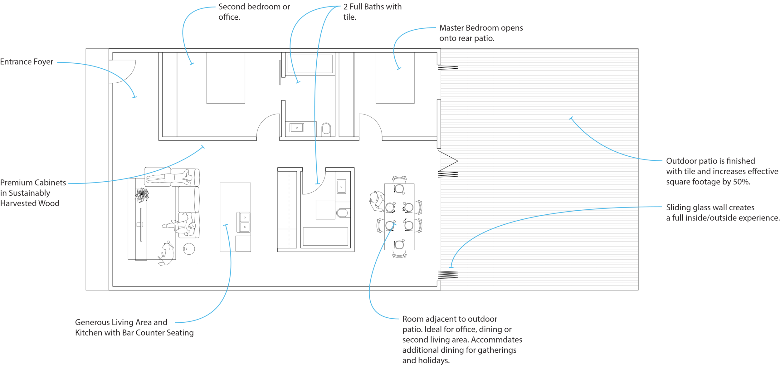This 1360 sf home easily adapts to the needs of an individual, couple, or small family. Interior squarefootage is extended through the provision of the large covered outdoor patio. A common area at the front of the house is augmented by a rear-yard facing room that provides for extra dining, living, or office functions. This provision of two separated living spaces in close proximity provides for ultimately flexibility of use by the home owner's. A private master suite with en-suite bathroom and yard access provides the head of household an oasis from the other occupant's activities. A second bedroom is generously sized to accommodate guests or a nursery or child's room. With it's centralized location in the common area, the second bathroom easily serves visitors or other family members.